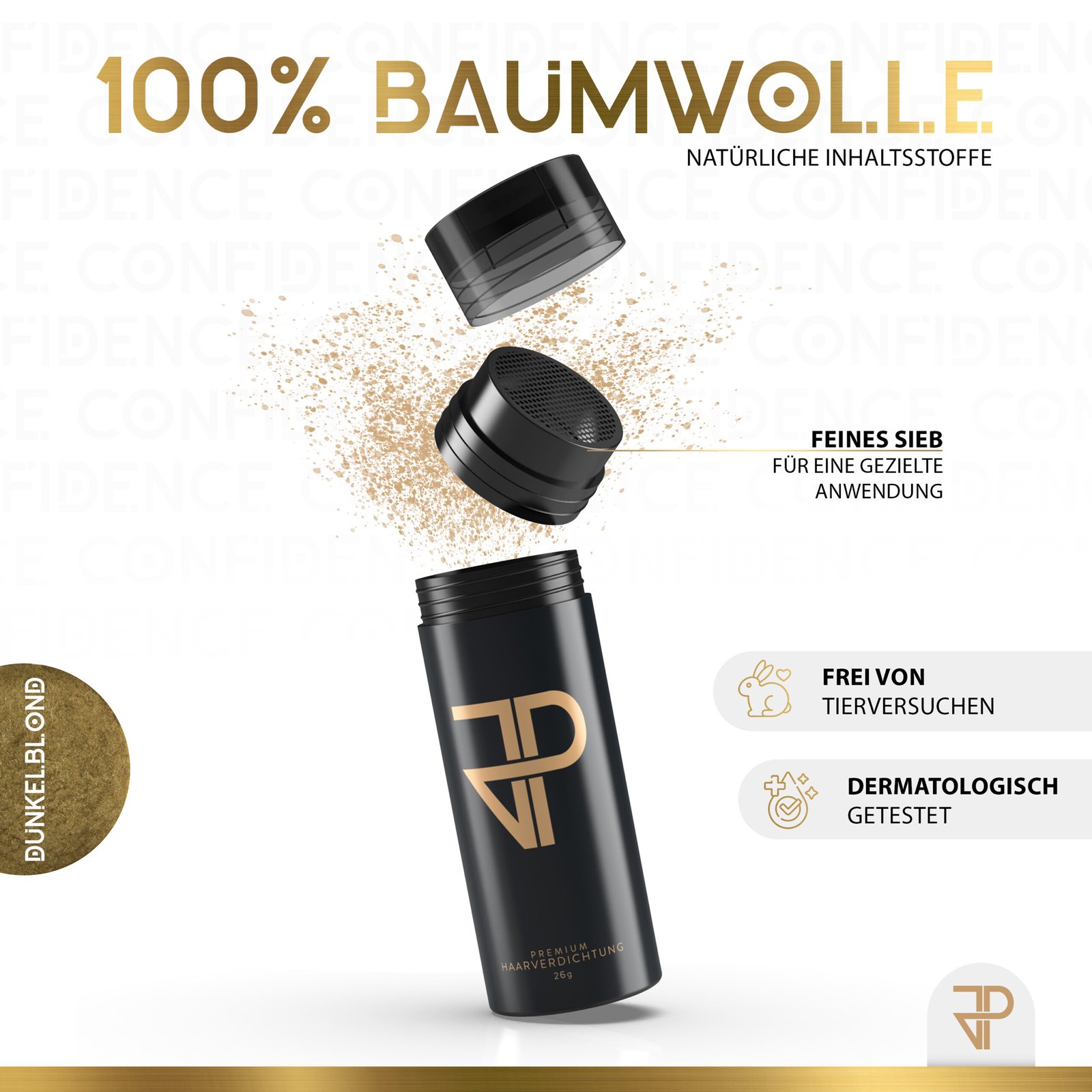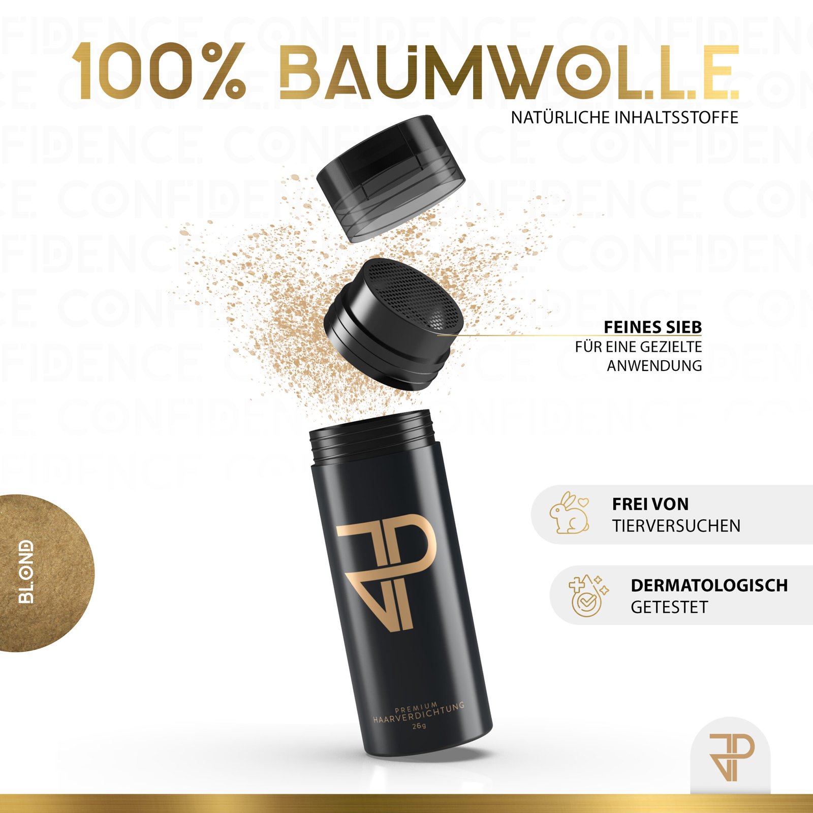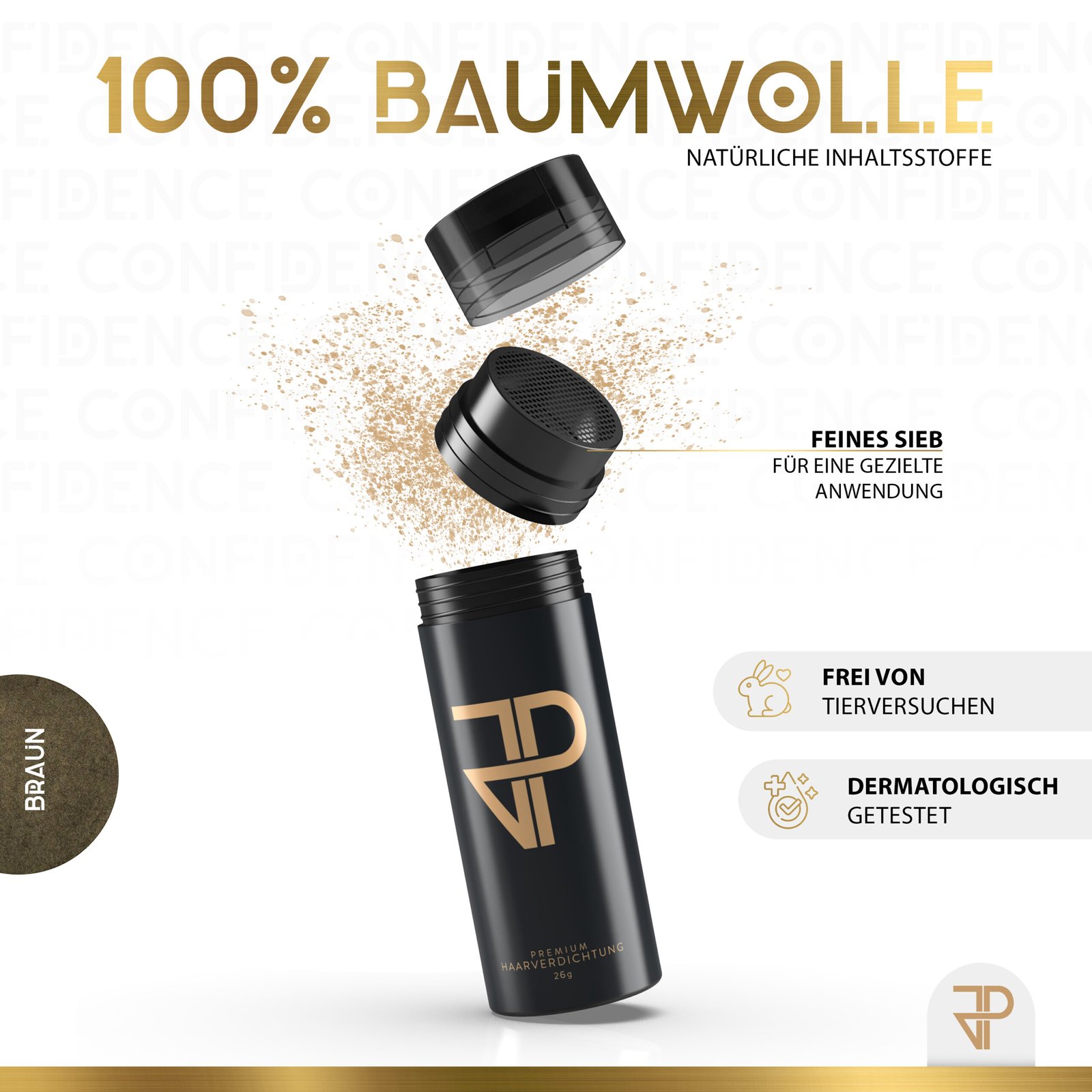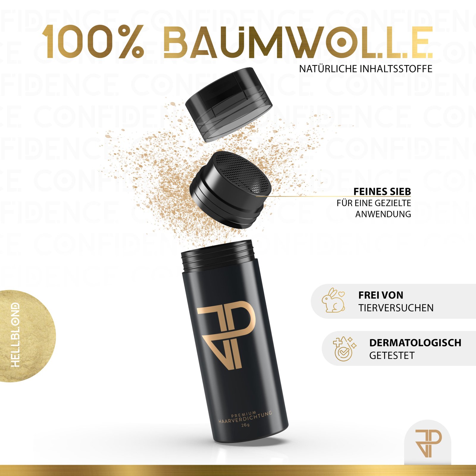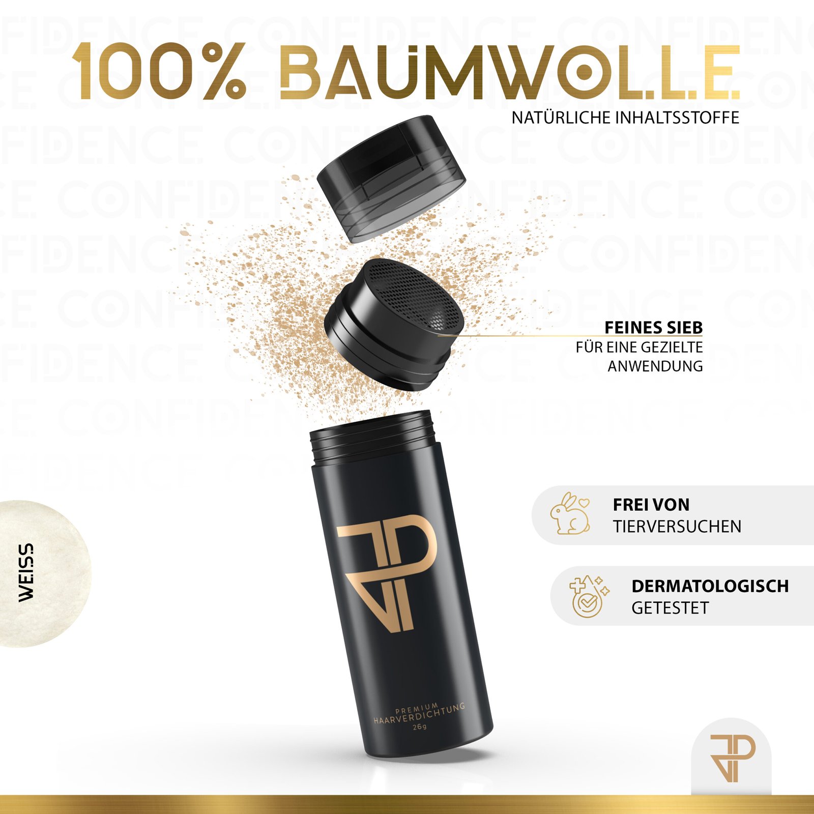 JP Confidence Streuhaar deckt ausgedünntes Haar sofort und makellos ab. Es hilft bei kahlen StellenGeheimratsecken und kreisrundem Haarausfall. JP Confidence Streuhaar sieht nicht nur völlig natürlich aus, es ist Dein Selbstbewusstsein aus der Dose. 10 Sekunden, die dein Leben verändern. GARANTIERT!