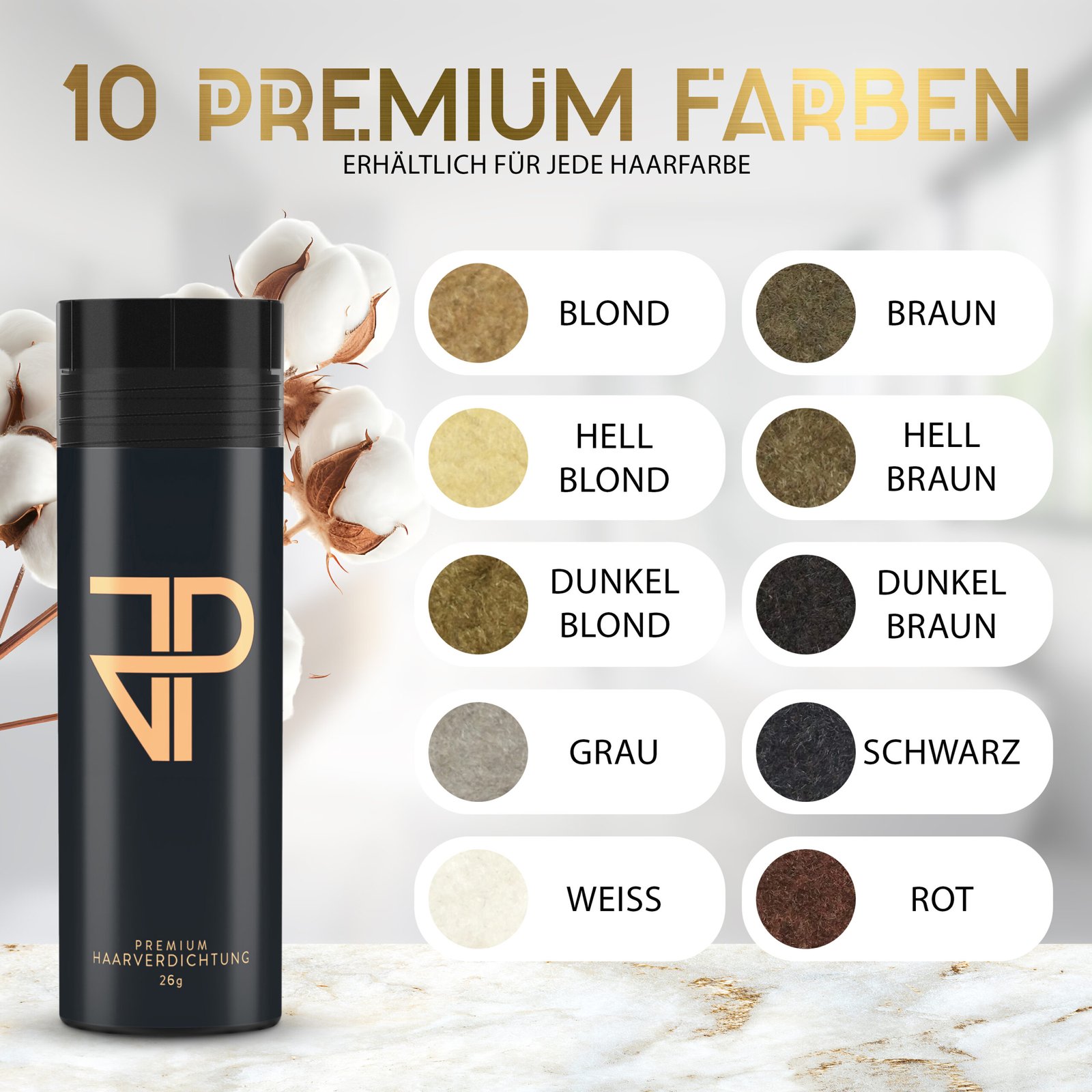 Unser Schütthaar steht dir in den den folgenden Premium-Farben zur Verfügung:
